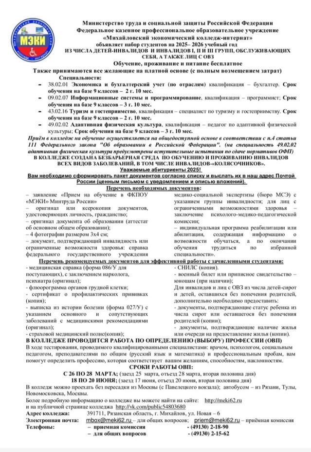 Набор кандидатов ведется из числа детей-инвалидов и инвалидов I, II, III групп, обслуживающих себя самостоятельно, а также из числа лиц с ОВЗ. Обучение, проживание и питание бесплатное!