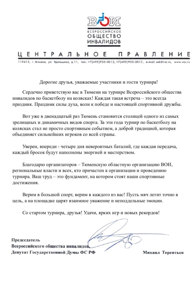 Сердечно приветствую вас в Тюмени на турнире Всероссийского общества инвалидов по баскетболу на колясках!